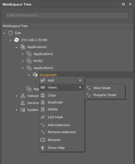 Open the context menu of a component, hover over the Views option, and choose a required view from the menu. For most components in nano EDGE ENGINE devices, there are two views available: the Wire Sheet and the Property Sheet; for Sedona devices there are three available views: the Wire Sheet, Property Sheet, and Slot Sheet.