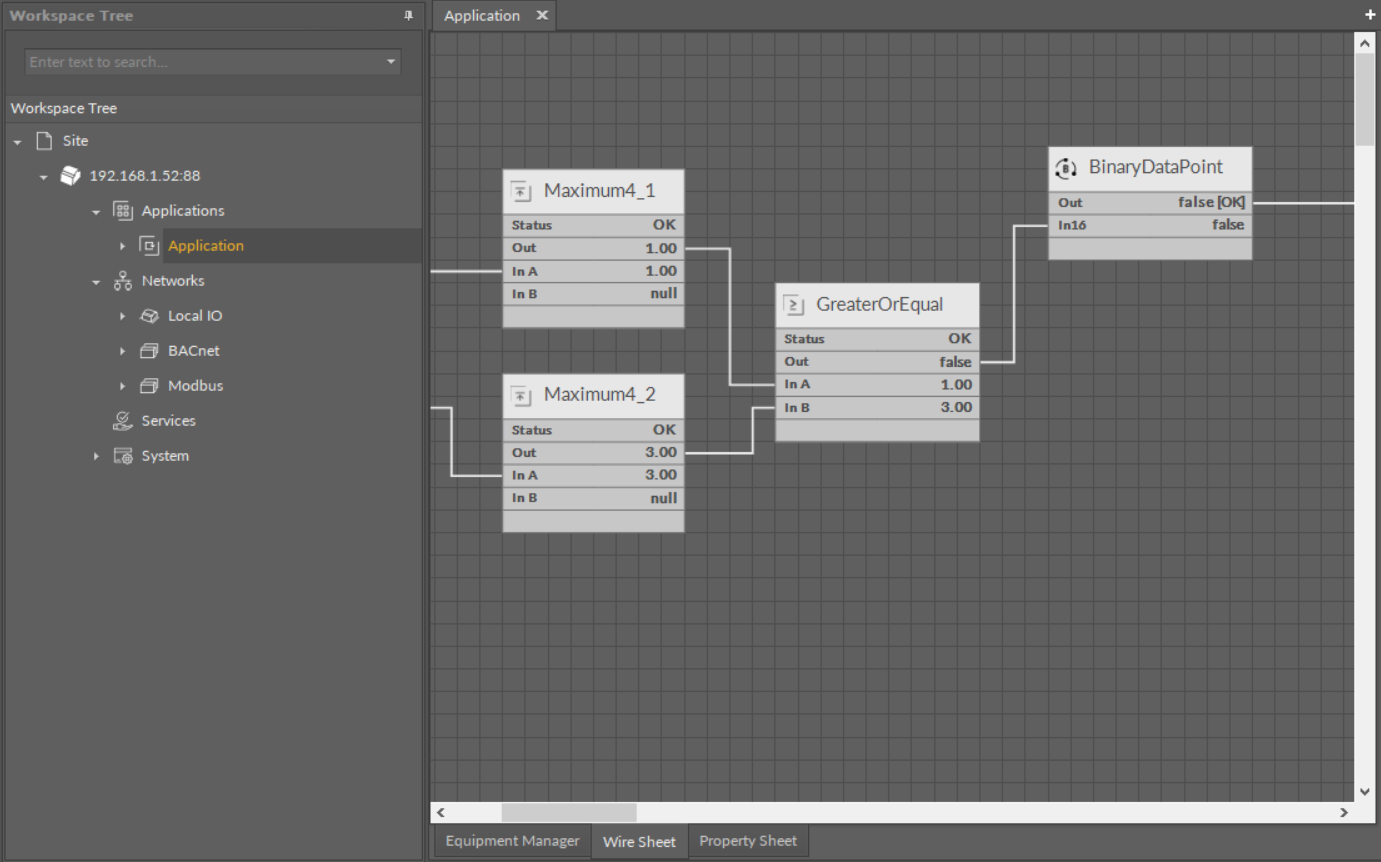 In the Wire Sheet view the user can define the location of components by dragging them by the header. To make moving components easier the Wire Sheet displays a grid allowing precise placement of the component. The grid makes organizing of components and their alignment easier.