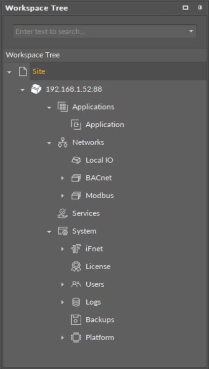 The Workspace Tree is designed to navigate the projects and devices defined for them. For each project, it is possible to define any number of folders and any number of devices inside them. It is recommended that the structure of folders, subfolders, and devices corresponds to their physical placement and/or logical subordination of devices on an object. It makes finding a particular device among a vast quantity of devices fast and easy. The structure of folders, subfolders, and projects, mentioned above, allows to properly locate a specific device in the Workspace Tree. The hierarchical structure inside the device is loaded directly from the device and consists of components.