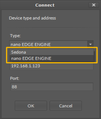 Port: shows a device’s port number (port is automatically selected according to the type of the device: 88 for nano EDGE ENGINE devices, 1876 for Sedona devices).