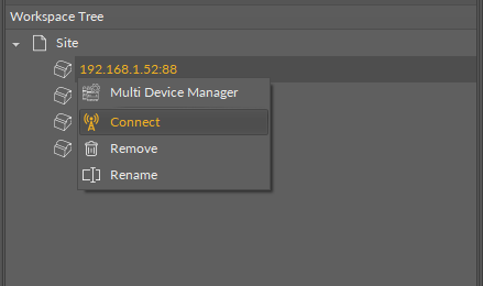 To connect the device, it needs to be added to the Workspace Tree: right-click anywhere in the Workspace Tree window, and add a new project from the context menu (in case the required project is already added, omit this step). Then, right-click on the project, and select the Add Device option from the context menu, which opens a dialog window allowing to configure basic connection data: