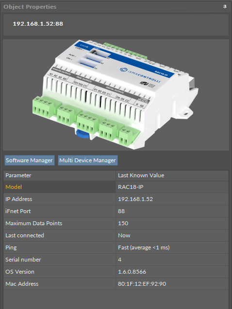 After confirming the entered authorization data by pressing Enter or OK button, the iC Tool begins the process of connecting and reading the components tree for the device. After a correct connection with the device, its application tree loads automatically in the Workspace Tree. If the device is selected in the Workspace Tree view, the Object Properties Window shows its picture and the most important parameters, such as IP address, serial number, or operating system version number. These parameters are available in this window even after disconnecting the device, which allows offline checking of, e.g., device IP number or its operating system version.