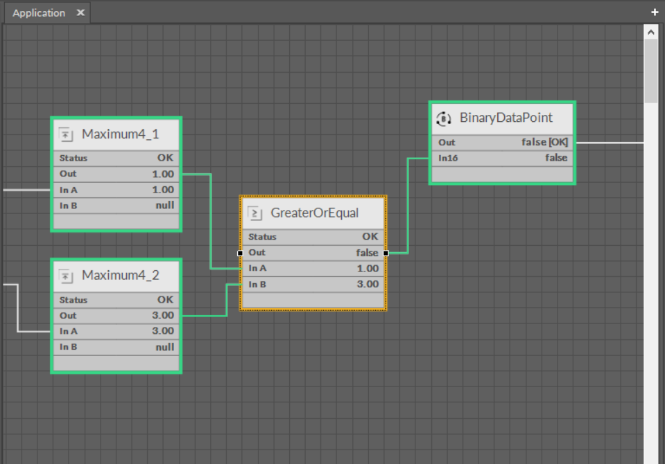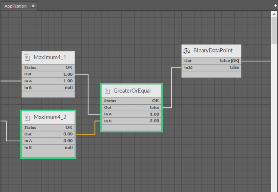 In the figure above, a GreaterOrEqual component has been selected and is marked with an orange frame. If it will be removed or moved, or duplicated, it has an impact on the links connected to it and their components. The whole path of connected objects has been highlighted in green. A coloring mechanism shown above may be very useful to analyze complex programs with many connections, links, and components.