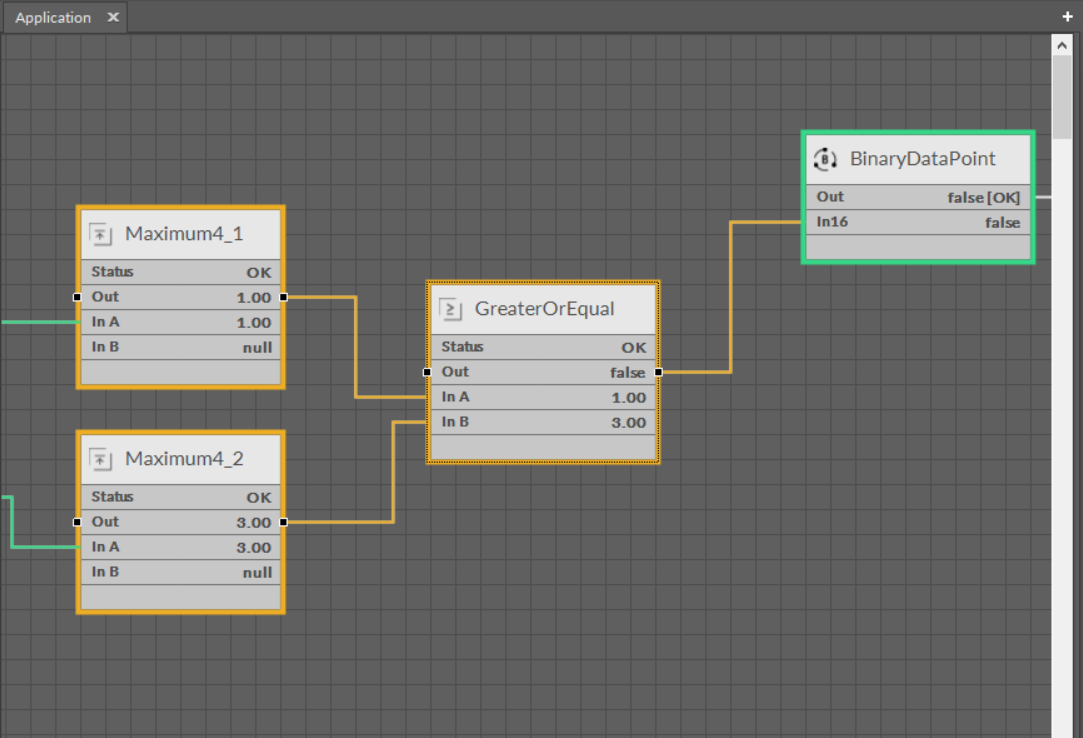 In case of a crossing selection the rectangle is dragged the opposite way, from the right to the left, and it is red. All the objects, even partially included in the rectangle, are selected (orange color); here, these are the Maximum, GreaterOrEqual, and Binary Data Point component along with their links.