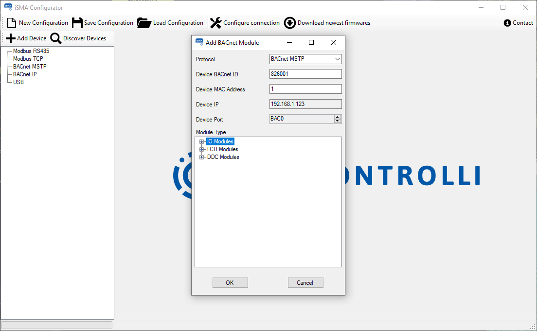 The process of adding a new device varies depending on the type of connection chosen for the project. Both protocol types ask for unique device identification on the bus. In case of Modbus, the Modbus address (MAC address filed) is required, but in case of BACnet, the BACnet ID is needed. To simplify the process, the system automatically calculates and proposes a BACnet ID basing on the MAC Address typed, assuming that BACnet net is built with default 82600 subnet (provided by the BACnet organization to all iSMA CONTROLLI devices).