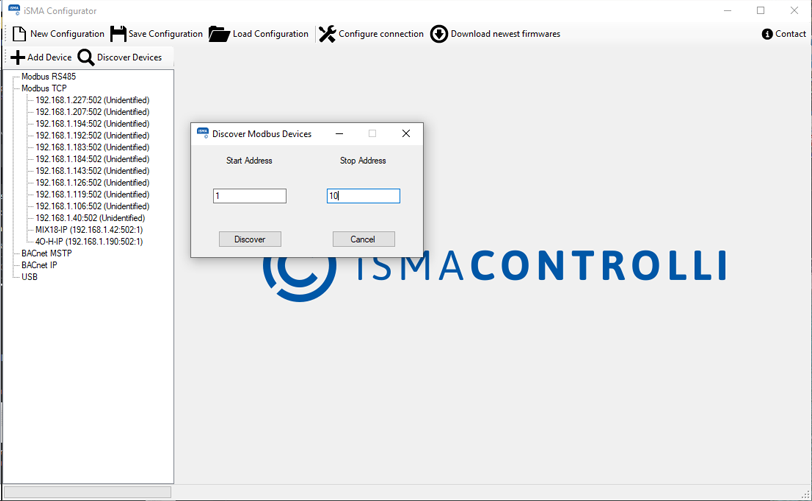 In its standard version, the Modbus protocol is not equipped with discovery function, but in case of iSMA Devices the discovery process can be performed using the iSMA Configurator software.