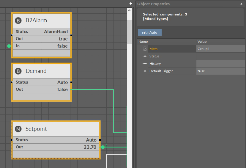 As shown on the figure below, selecting 3 components of different types (NVBooleanWritable and NVNumericWritable) resulted in showing only 4 common slots in the Object Properties window. ‘Meta’ and ‘Default Trigger’ slots have identical values in all components and they are displayed in the mixed view. The remaining 2 slots, Status and History, have different values, therefore there are empty spaces in the place of value fields.