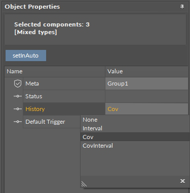 Using this multi-select function for an editable slot enables entering a new value (e.g., Cov for the History slot) which will be sent to all 3 components at once, as is shown on the figure below.