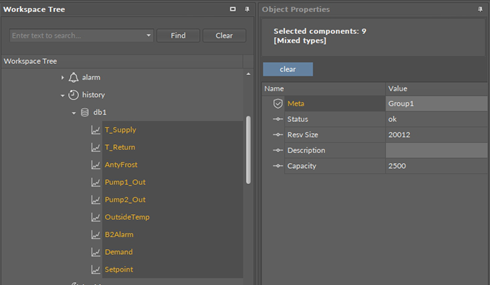 A good example is an action erasing saved historical samples in all historical components. For this purpose all historical components in the Workspace Tree have been selected and the Object Properties window has shown modified content, as shown on the figure below: