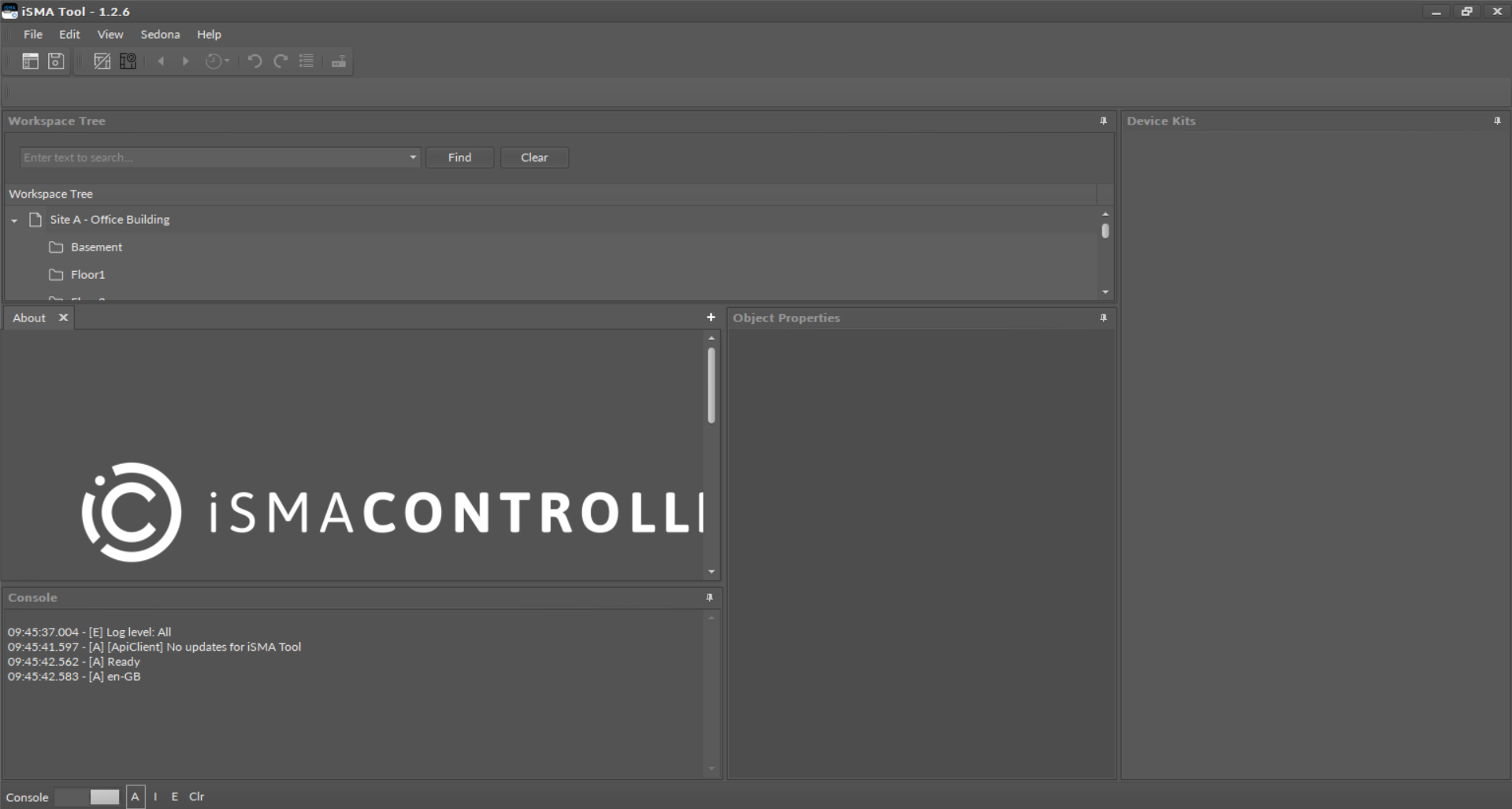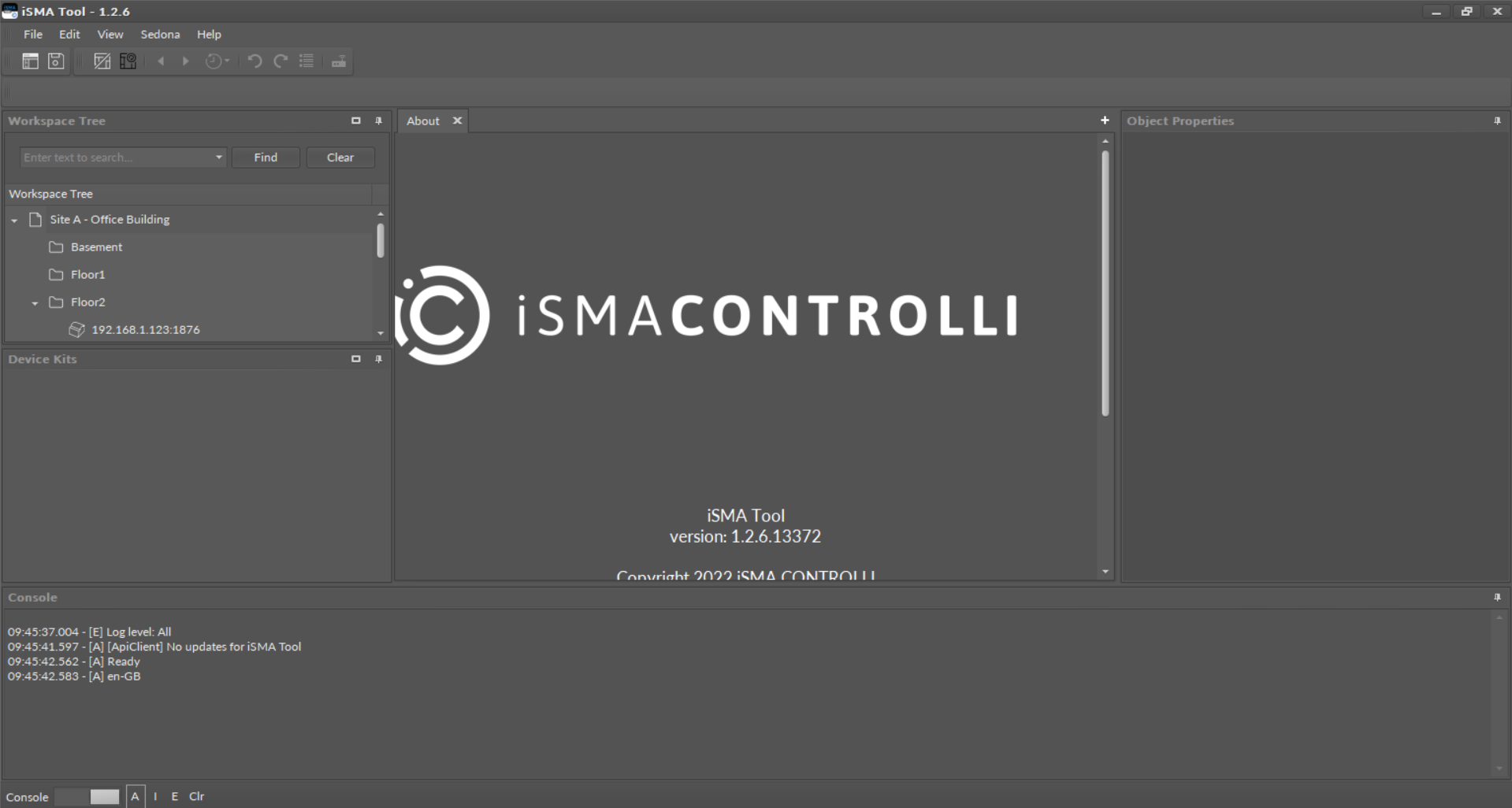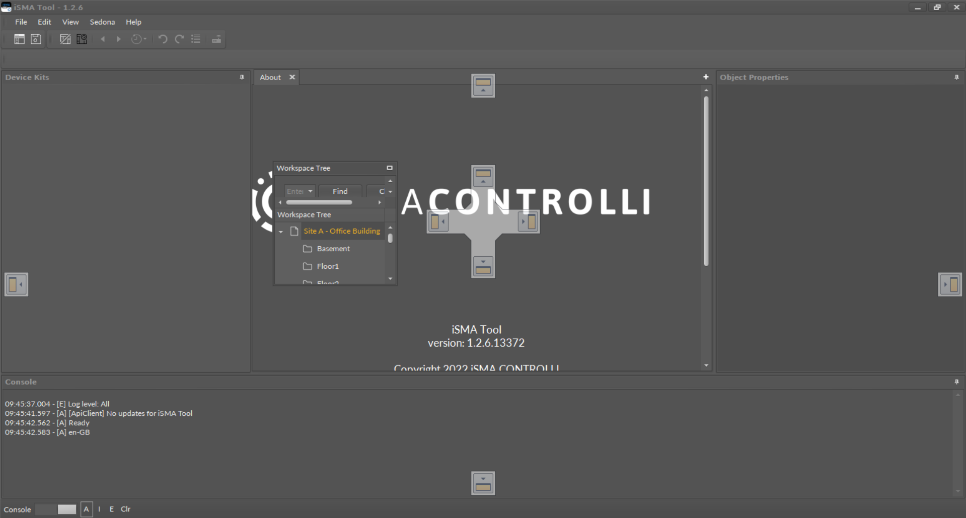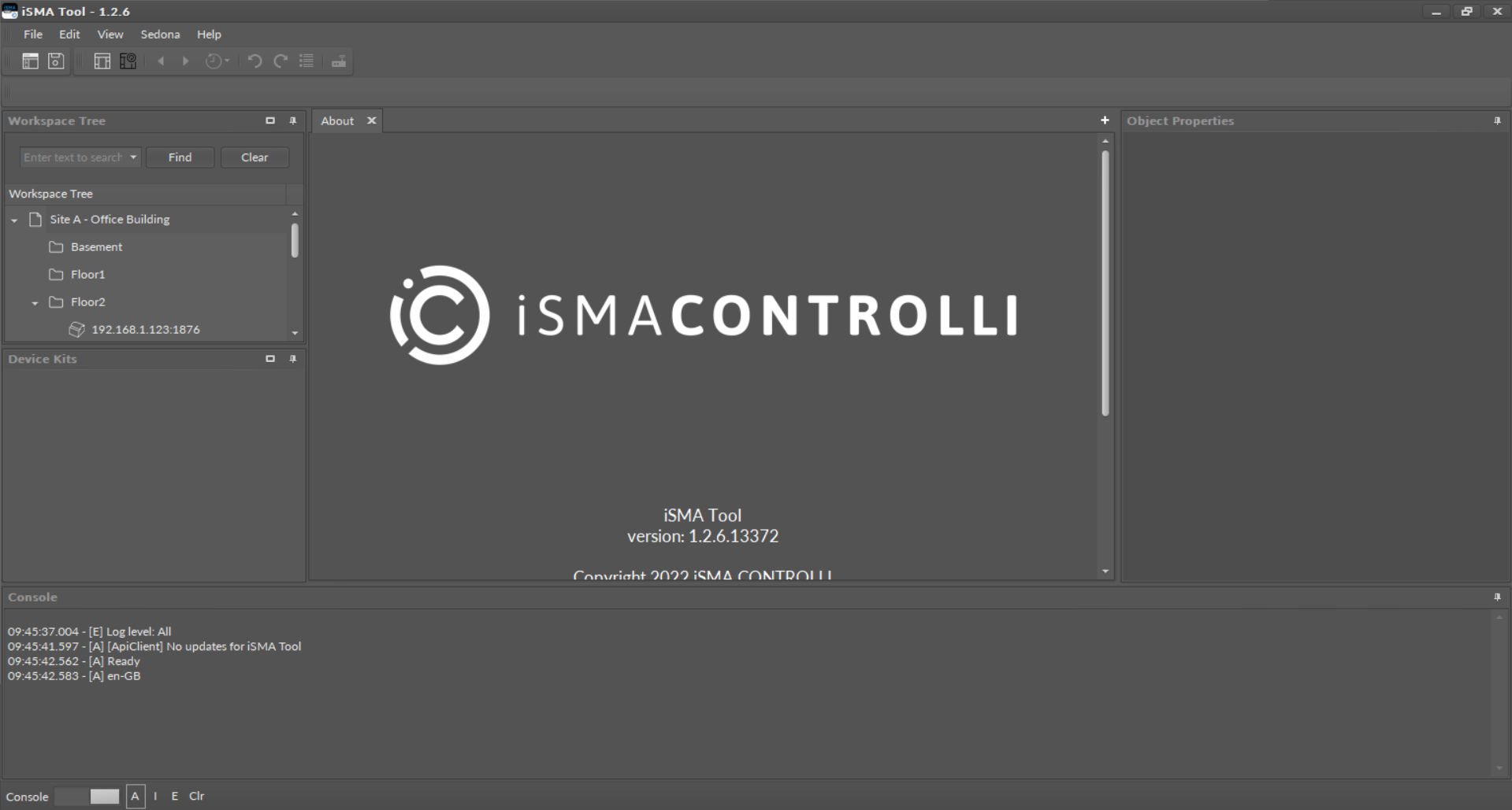 In the default settings of the iSMA Tool, the upper left side of the screen is occupied by a Workspace Tree window. Below is a Device Kits window showing current kits of the connected device. Central part of the screen is occupied by a Main screen, a space where the application’s views are shown on tabs, which is discussed further. After the iSMA Tool activation the Main screen shows program information shown on the figure above. Under the Main screen there is a Console window, and on the right there is an Object Properties window.