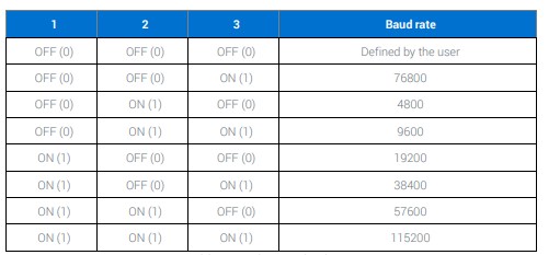 First three Protocol DIP switches are used to define the RS485 communication baud rate according to the table below.