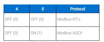 The iSMA-B-2D controller can communicate using the Modbus RTU and Modbus ASCII communication protocols. Using the fourth and fifth DIP switches defines, which protocol is used, according to the table below: