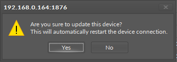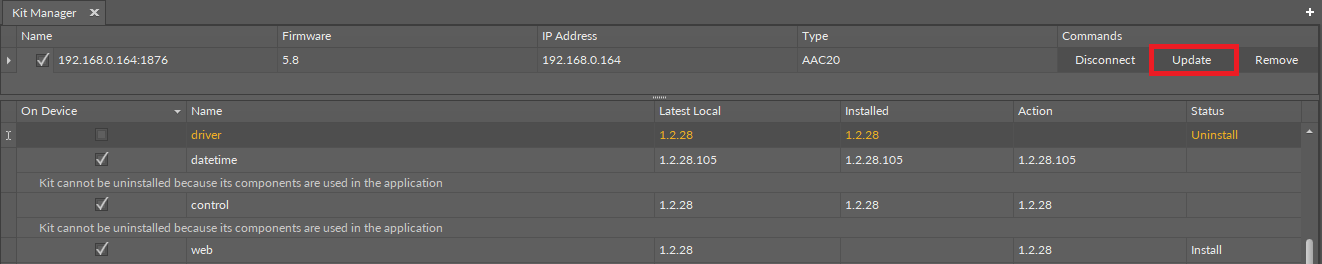 6. To install/uninstall kits from the device in "Kit Manager" click "Update" in the "Commands" column. A pop-up window informing you to restart the device after updating the kits will appear.
