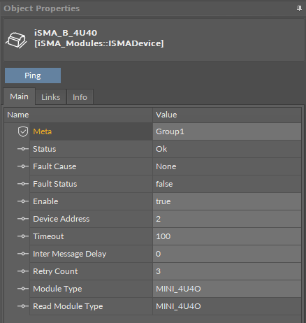 5. Switch the "Enable" slot to "true" and set the "Device Address" to the "Rotary Switch" of the iSMA module. If the device has been correctly configured and the driver communicates with it, then the value in the "Status" slot will be "OK".