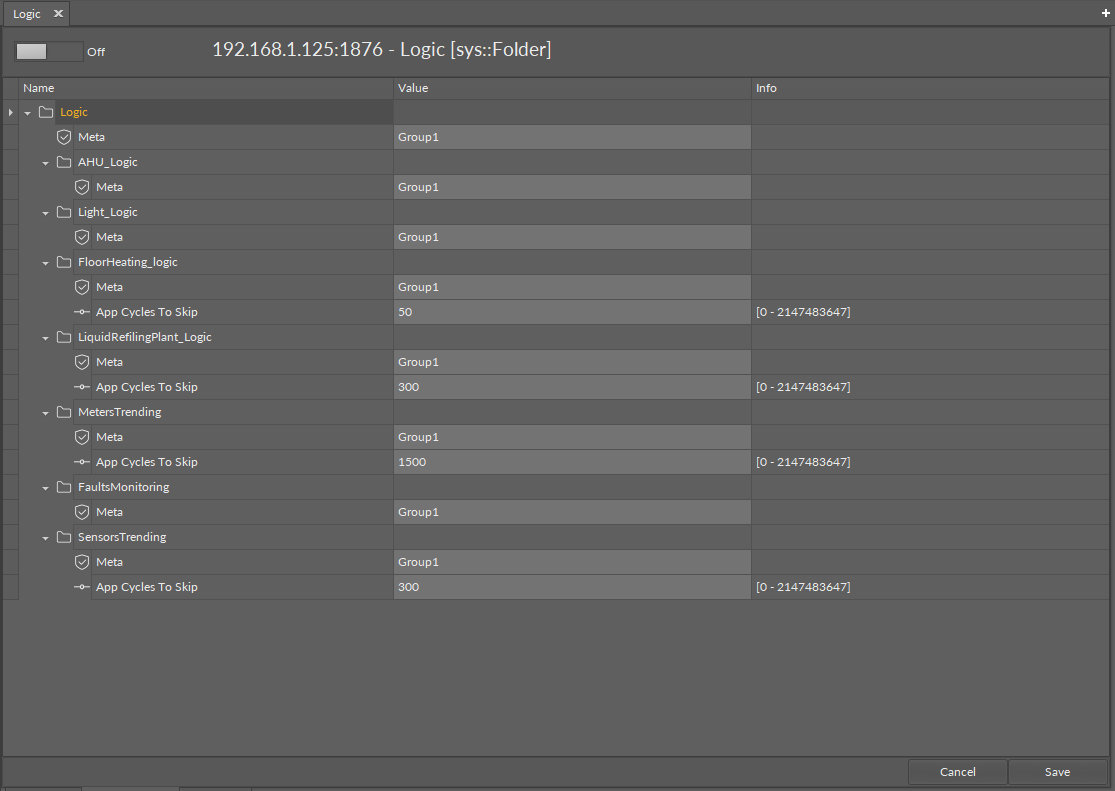 In iSMA-B-AAC20 controllers, the application has one operating cycle in the 'app' component in the 'Scan Period' slot (by default, 200 ms). According to the time value set in this slot, all calculations and other operations (i.e., actions) in the logic are carried out. It happens that an integrator needs some calculations processed more often (e.g., every 100 ms) than others, which can be carried out in longer periods of time (e.g., every 1 min or every 15 min). If a controller's application is not too complex, the logic can be calculated easily in short periods of time as it does not overload the controller's microprocessor. If the application grows, the 'Scan Time' component's value, which indicates the actual time of the application operating cycle, can exceed the time set in the 'Scan Period' slot. As a consequence, the application operating cycle can be restarted with unfinished processes remaining from the previous cycle, and part of the logic can be blocked.