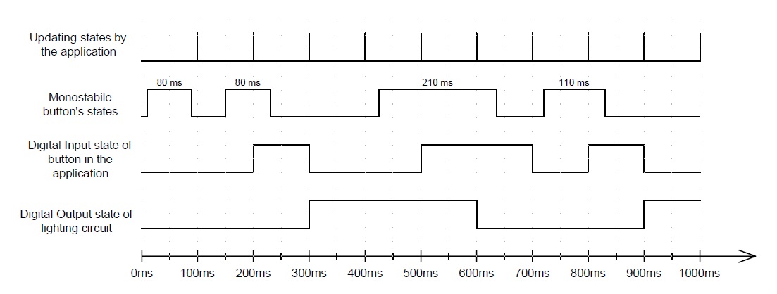 Figure 5. Timeline illustrating moments when the application updates states of inputs (the application cycle of 100 ms), mechanical changes of the monostable switch state, values of the digital input and digital output linked to the logic, which changes its value on the rising edge of the digital input
