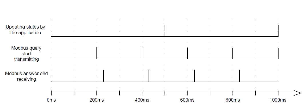 Figure 1. Timeline illustrating moments of sending requests and receiving answers in the Modbus protocol (Fast Rate set to 200 ms) and moments when components in the application update their values
