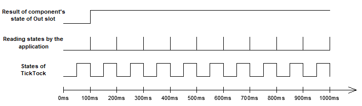Figure 3. Timeline illustrating changes of state of internal variables in the 'TickTock' components ('Ticks Per Sec' set to 10) and the 'Out' slot considering the main application cycle (100 ms)
