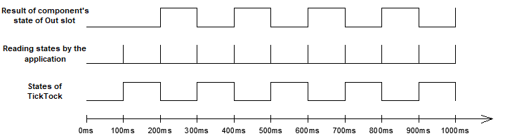 Figure 4. Timeline illustrating changes of state of internal variables in the 'TickTock' components ('Ticks Per Sec' set to 5) and the 'Out' slot considering the main application cycle (100 ms)