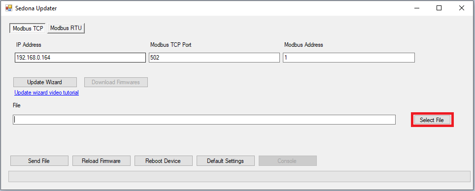 Start Sedona Updater. In "IP Address", enter the address of the device with which the user would like to connect.