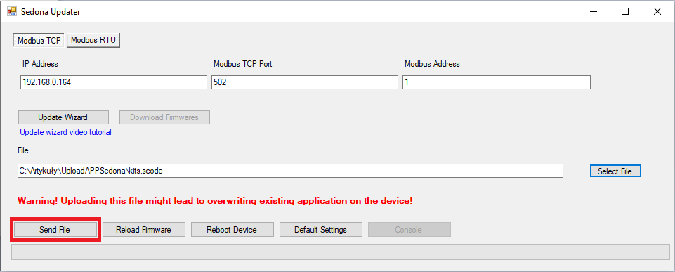 3. First, the set of kits (file "kits.scode") needs to be uploaded. The file is being sent by clicking the "Send File" button.