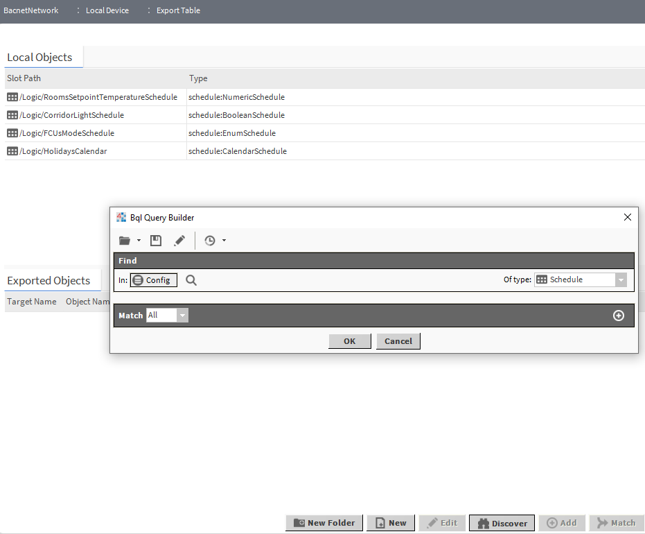 Next, go to the ‘Config/Drivers/BacnetNetwork/LocalDevice/ExportTable’ and open the ‘BACnet Export Manager’ view. Here, use the ‘Discover’ option, which brings about a pop-up window generating a BQL request; by default, the whole range of the station is searched, and this has not been changed in the example, but the component’s type has been set to ‘Schedule’. Confirm with OK; in the ‘Local Objects’ section, all discovered components are displayed.