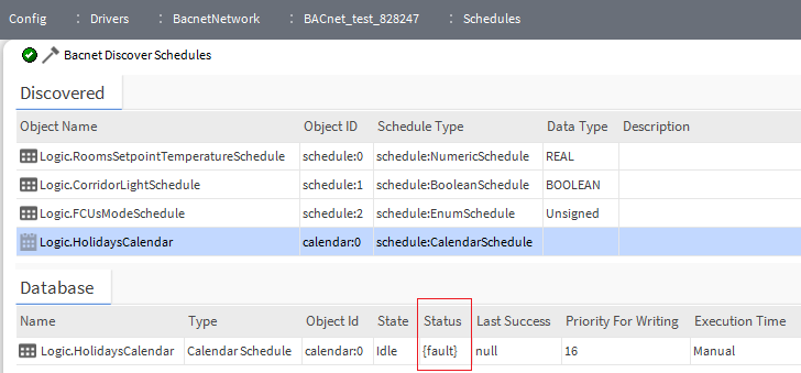 WARNING: If schedules created on the exporting device have not been set to a limited time (which is covered in point 1), than after their import, they go into the ‘fault’ status in the BACnet driver with ‘ASN:Date contains Special Values’ error notice: