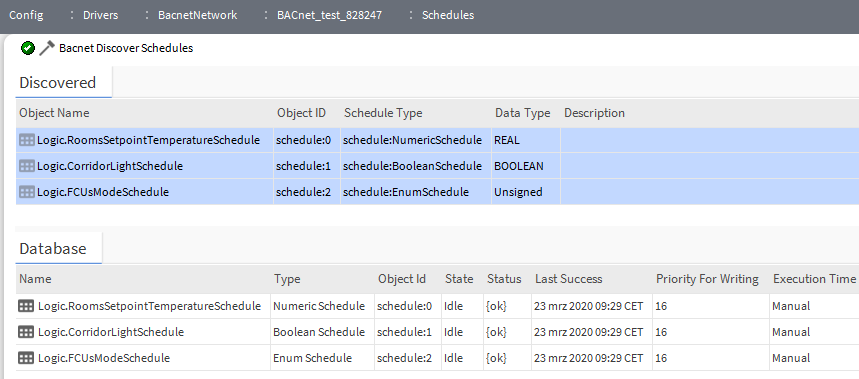 Go to the ‘Config/Drivers/BacnetNetwork/Device_Name/Schedules’ in the ‘BACnet Schedule Import Manager’ view, and use the ‘Discover’ option. In the ‘Discovered’ section, all published (in a searched device) schedules are displayed. Discovered schedules can be dragged&dropped to the ‘Database’ section. The below figure shows appropriately configured network synchronization of schedules: