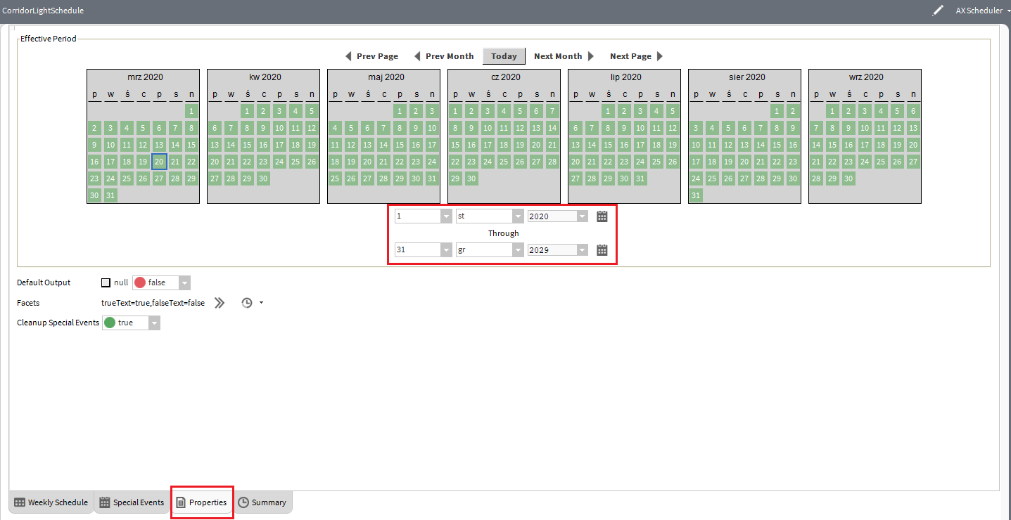 WARNING: It is essential to set the schedules to a limited time, as it is not possible to export unlimited schedules - in the importing device, components go into the ‘Fault’ status, and the following error notice is displayed: ‘ASN:Date contains Special Values’. For the 2020 year, limit the schedule as indicated below (please remember that after the schedule’s ending date it does not work, so it is recommended to set an additional alarm, repeated for several days before the end of the schedule, or to push the ending date every time the system is serviced).