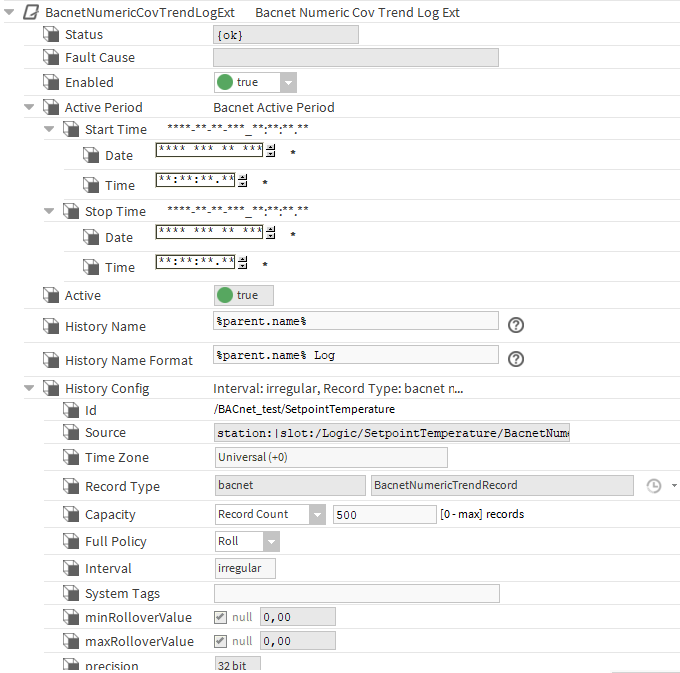 In this method (offline or online), add the extension from the ‘bacnet’ module palette in the ‘Trending/BACnetLogExtensions’ folder to the ‘BooleanWritable'/'EnumWritable'/'NumericWritable’ component. Apart from standard options of historical extensions (from the ‘history’ module), there are also options to limit time of exposing historical data in the BACnet protocol ('Active Period').