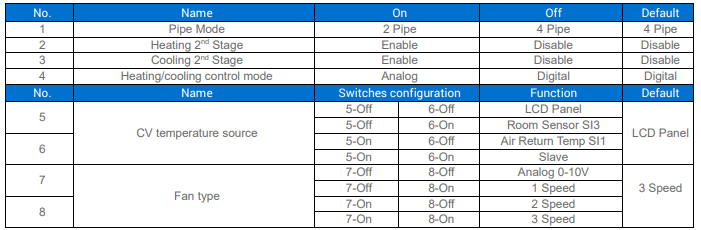 Pipe mode system - 'DIP switch' number 1, depending on the position, is used to select two-pipe mode ('DIP switch' to 'ON') and four-pipe mode ('DIP switch' to 'OFF').