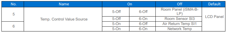 The default application in the controller can work with four different temperature sources, depending on the type of fan coil or the project on which the controller is to work. The temperature source can be changed using the 'DIP switch' numbers 5 and 6.