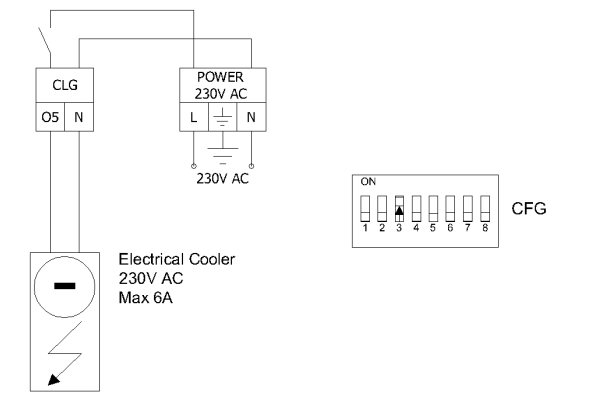 Dedicated output in iSMA-B-FCU for connecting an additional cooler is the O5 output. The second stage of cooling can be activated by switching the 'DIP switch' 3 to the 'ON' position.
