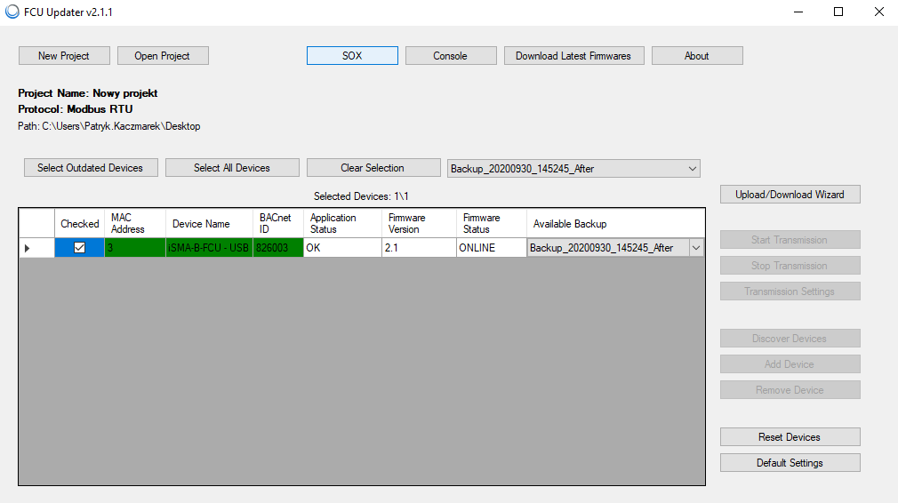 Open the FCU Updater software and create a new project in it or open an existing one and then select the 'SOX' option.