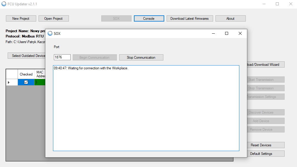 2. After selecting the 'SOX' option, a pop-up window will appear in which you should click on 'Begin Comunication', then the device is ready for connection in iSMA Tool. Creating a project is not required to run the 'SOX' protocol, but it allows for checking the status of iSMA-B-FCU before connecting to the iSMA Tool.