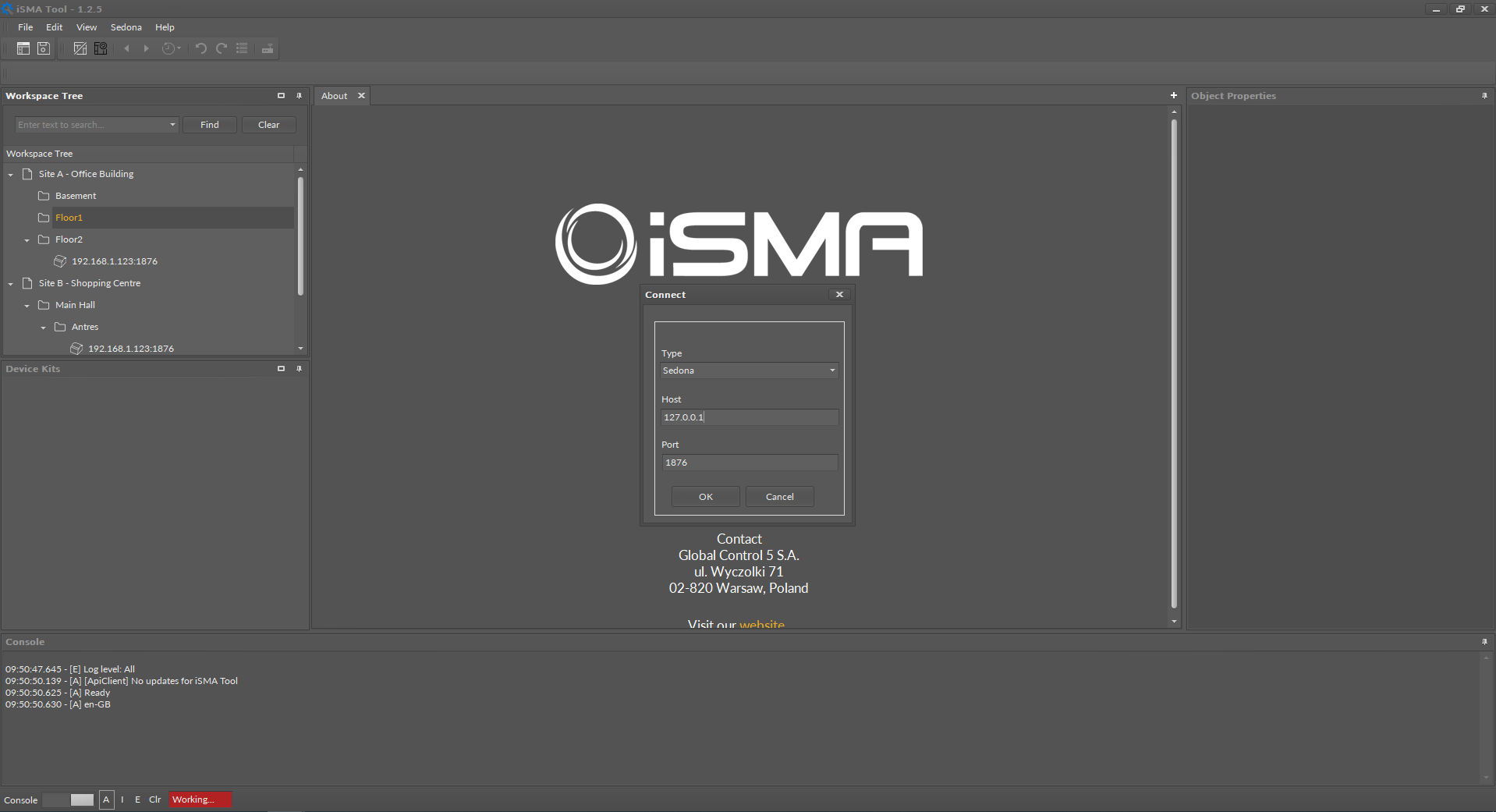3. After performing the above steps, turn the iSMA Tool on. In the 'Workspace Tree' view, right-click and select 'Add Device'. In the pop-up window, in the 'Host' field, enter the device address, which is 127.0.0.1 or localhost. In the next window, leave the below, default login details: