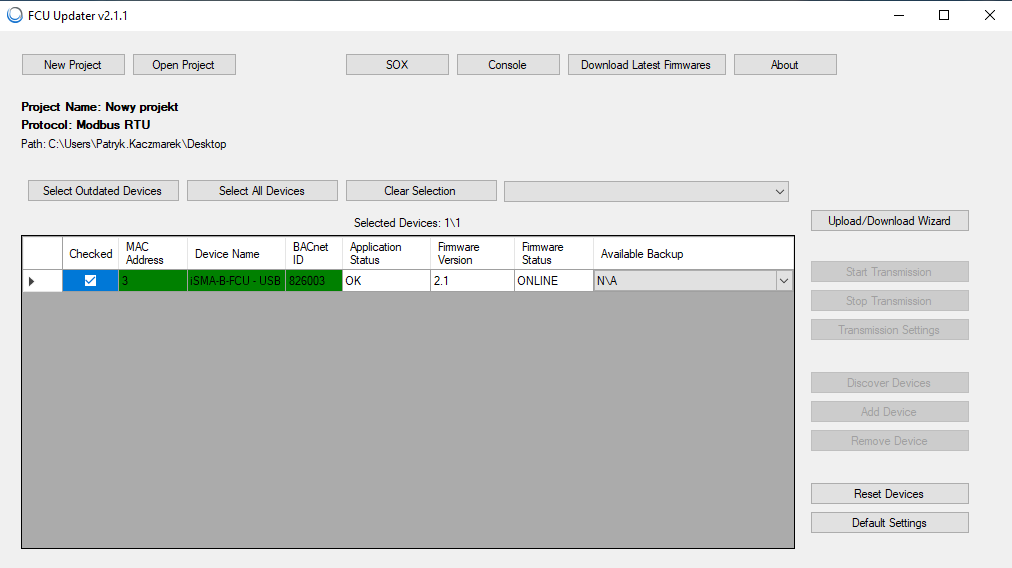 Once the project is created in FCU Updater, the connected device will be displayed.