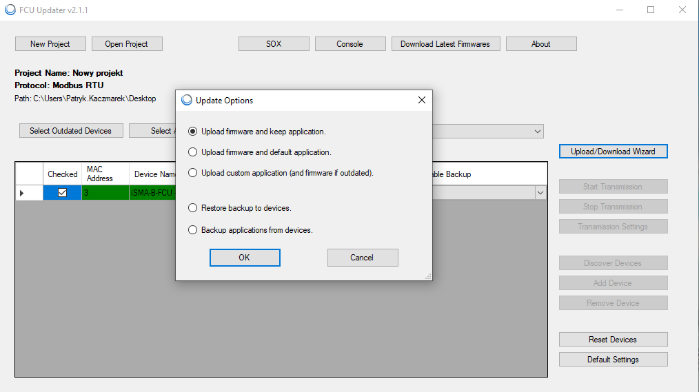 2. In the next step, select the device by checking the 'Checked' box to which you want to upload the application or update the firmware. Then, select the 'Upload / Download Wizard' option and click on one of the three options you're interested in.