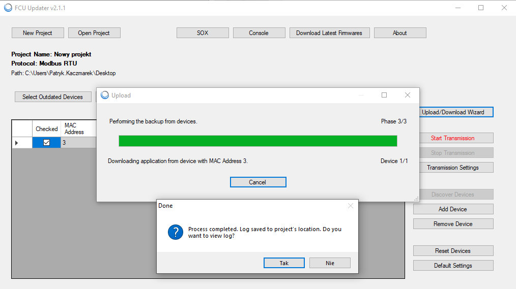 3. After correct firmware and application upload, a message about the completed update process and the possibility of displaying logs will be displayed.
