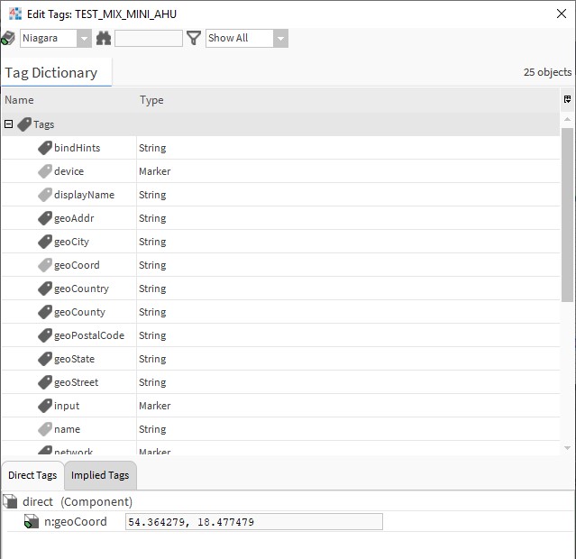 - Import any Niagara station via FOX(s) protocol, right click on the station, and open the Edit Tags window. Add the tag n:geoCoord and enter the geographic coordinates of the station's location separated by a comma into it.