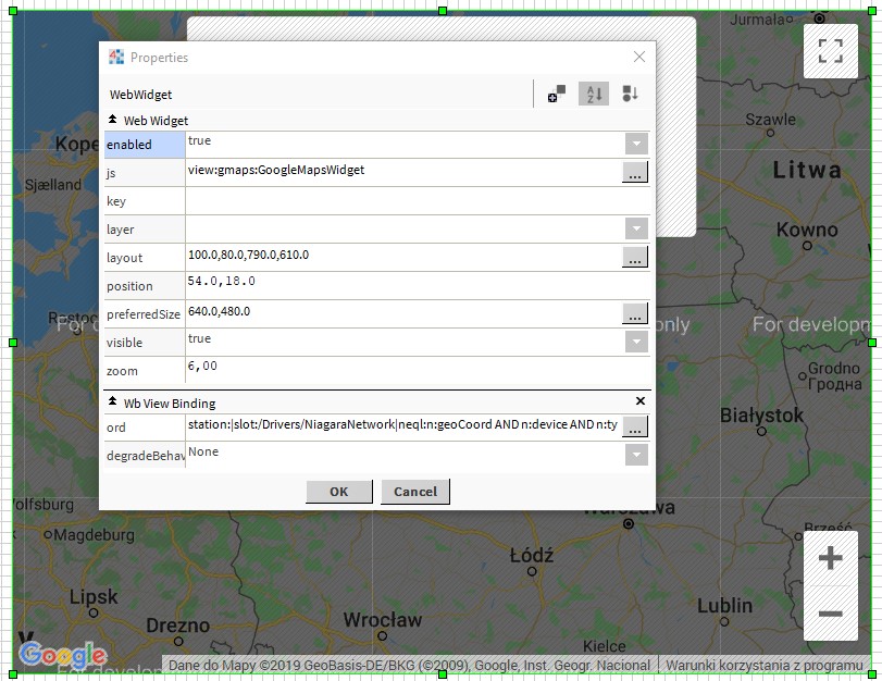 - Open the properties window of the Google widget and, in the key slot, enter the previously registered API key.