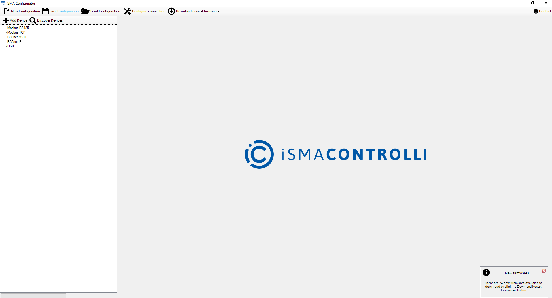 First, open iSMA Configurator (you do not need to install it, as it is of 'portable' type). On the top navigation bar, there is 'Download newest firmware' button, after pressing it, the latest firmware versions for all iSMA modules will be downloaded and saved on the PC. A pop-up window informing about the downloaded firmware versions will appear in the lower right corner.