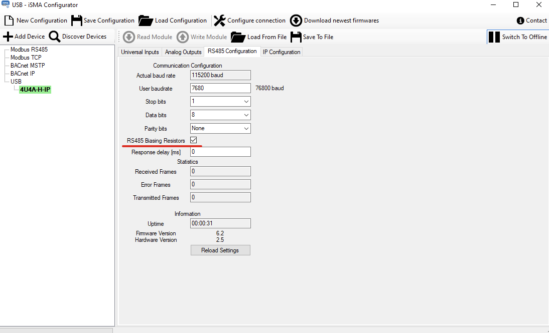 In the gateway device, check if the RS485 biasing resistors option is enabled.
