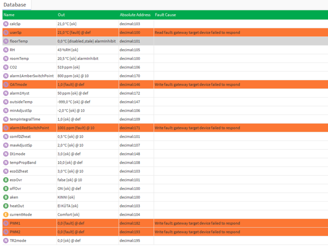 A device used as a gateway module does not communicate with the controller. An RS485 communication is broken or does not proceed properly, for example, points spontaneously go into the Down status.
