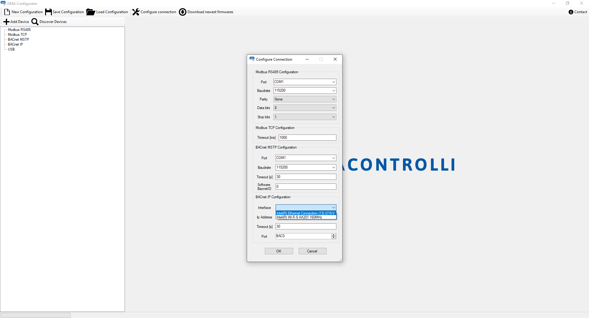 First, open iSMA_Configurator (you do not need to install it as it is of portable type). In the side navigation bar, there is a list of supported protocols, after right-clicking on 'BACnet IP' a drop-down list will appear. The 'Configure Connection' option allows you to configure the 'BACnet IP' communication parameters. In the pop-up window in the interface tab, select which adapter on the computer will be used for the search. Additionally, if the iSMA-B modules have a different BACnet port than the default one, it can be changed in the port tab.