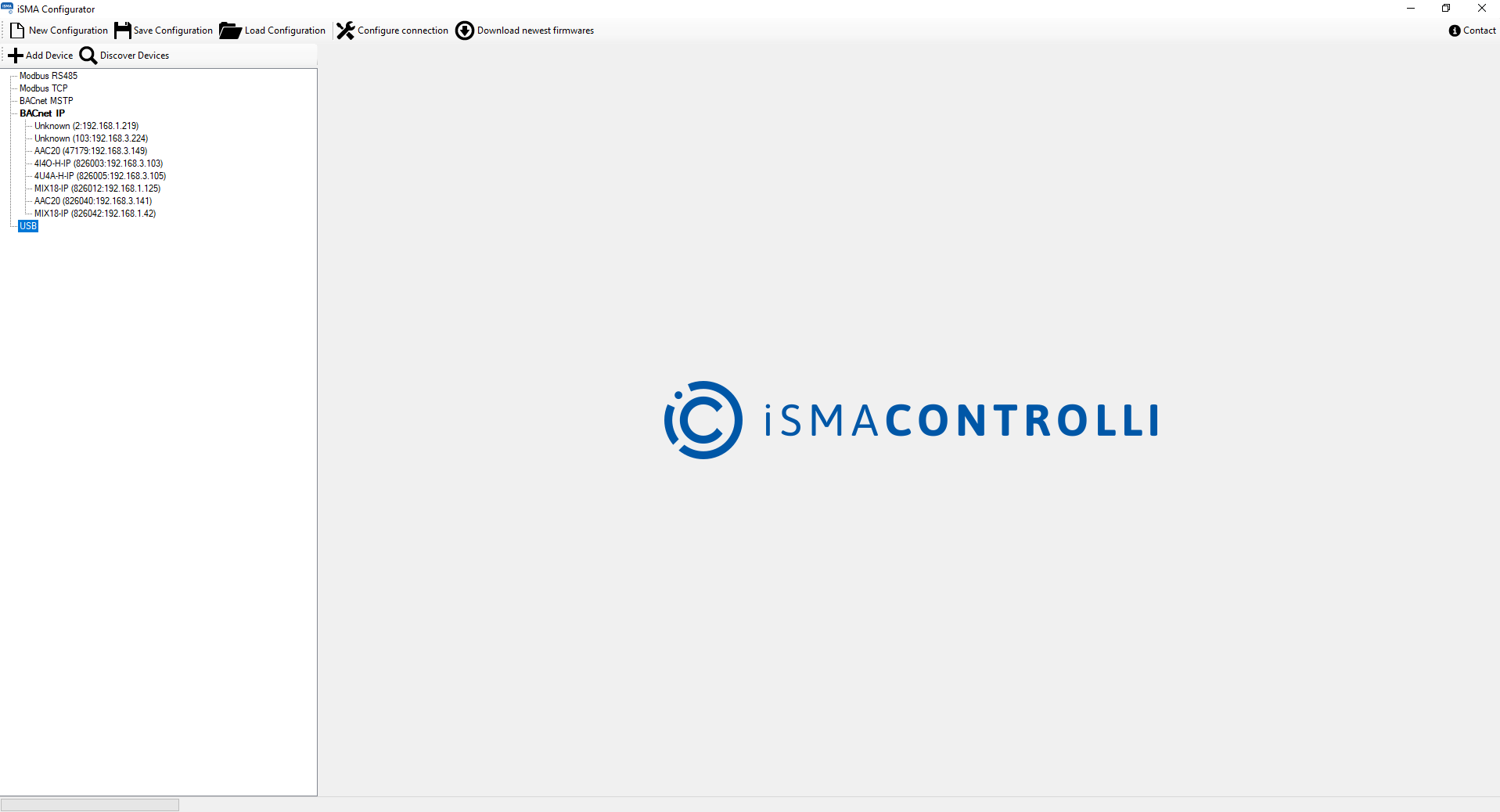The following article describes how to automatically search for multiprotocol I/O modules in iSMA_Configurator using BACnet IP protocol. Before starting the search, prepare a PC with a Windows operating system, a USB - RS485 converter and download iSMA_Configurator from iSMA CONTROLLI Download Center