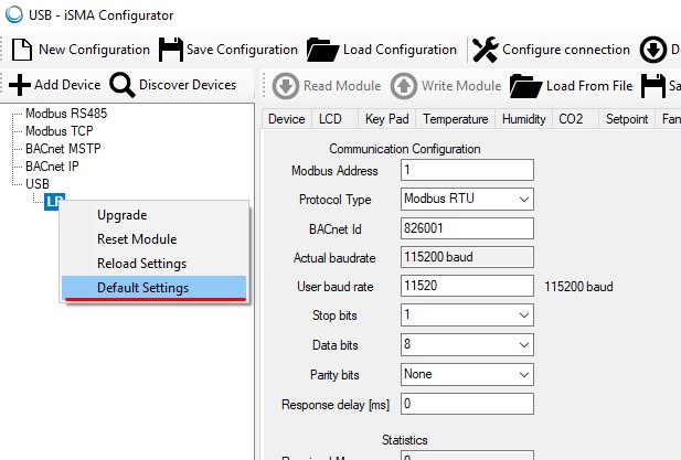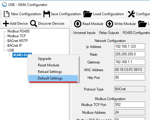 Restoring default settings can also be performed using iSMA Configurator. Use a USB cable to connect to the module and go to the Default Settings option in the context menu as below: