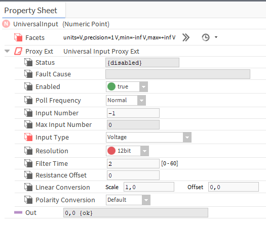 There is a known problem with iSMA_IO version 2.0.1.0, more specifically with the UniversalInput components. It occurs when the component is set as Input Type → Voltage and the default Facets (null) is changed:
