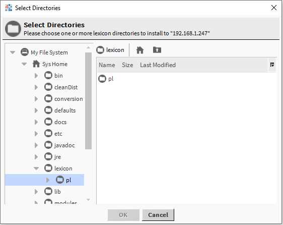 8. Go to the "Lexicon Installer" and click "Install". In the pop-up window, select the "SysHome/lexicon/your_lexicon" (in the described example, it is "SysHome/lexicon/pl"), and confirm with OK. This way, the lexicon is added to the controller.