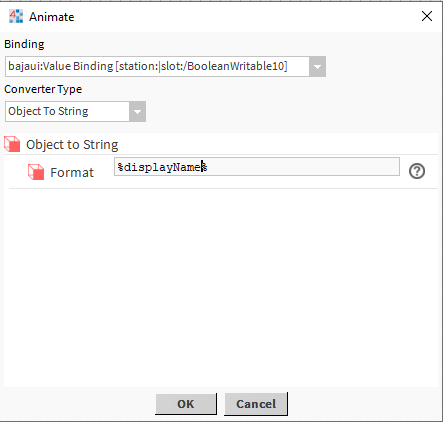 4. Animate each text slot one by one (in the "Label" widget) to the created "Value Binding" using the "Object To String" object and set the format to "%displayName%".